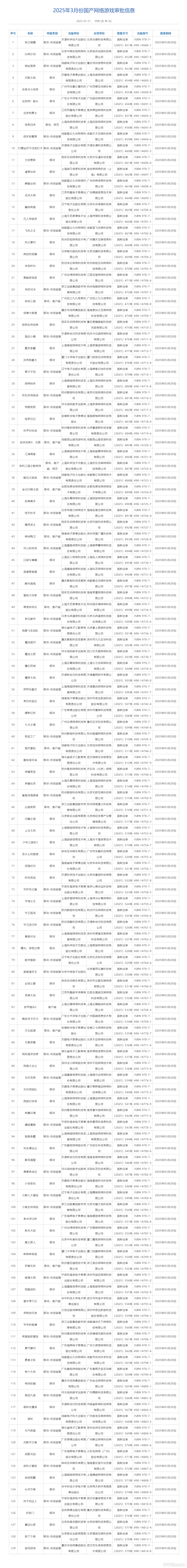 2025年3月21日,国家新闻出版署公布了3月国产网络游戏审批信息,129款游戏喜获版号,另外还有5款进口网络游戏过审,5款游戏审批变更信息。