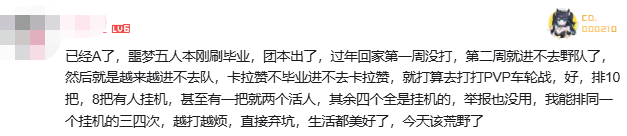 所以现在的游戏氛围既看不到人间烟火,也看不到江湖恩怨,世界大部分都在出金收金,卖号脱坑,或者宣传代打包车。当PVE和休闲玩家打不过副本,PVP玩家没有纷争,无所事事,PVE玩家没有社交环境和休闲玩法,就会发现上线只能发呆或者看风景,自然会想弃坑。